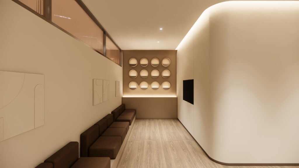 이번 프로젝트에서 대기 공간 벽면에는 둥근 선반들을 규칙적으로 배치했습니다.