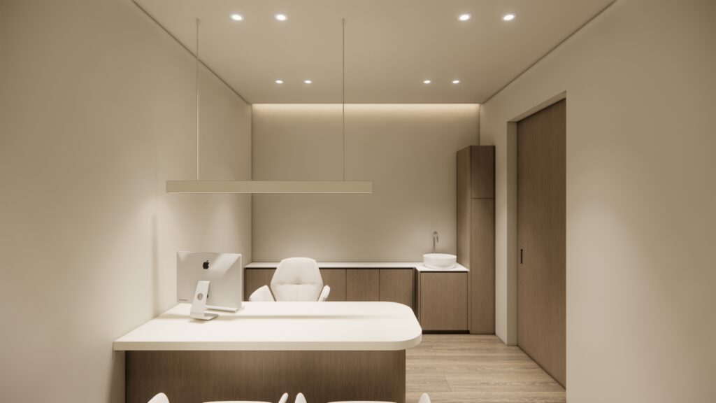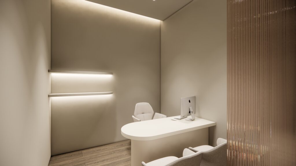 앞서 글에서 말씀드렸지만 리셉션 데스크, 파우더룸 세면대, 진료실 카운터 등 주요 가구들의 소재를 통일하면 공간 전체가 훨씬 고급스럽고 일관성 있게 완성됩니다.