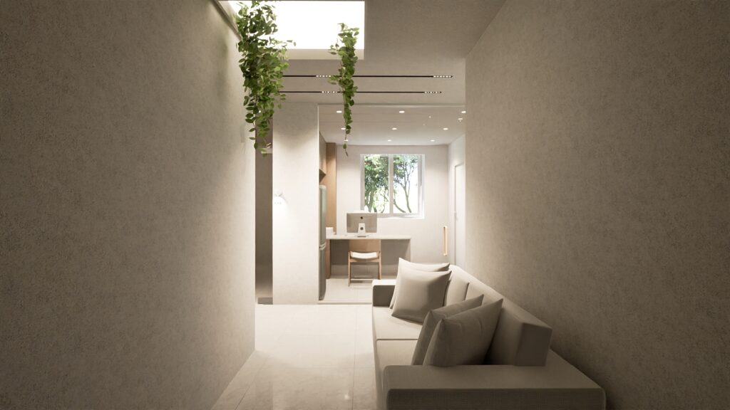 천장 유리창에서 햇빛이 쏟아지는 것 같은 이미지를 연출하여, 진료 전 긴장을 풀어줄 수 있는 공간으로 기획했습니다.