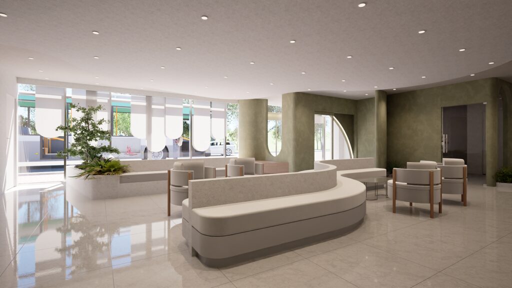 환자의 심리적 안정을 위한 곡선 디자인, 자연 요소를 공간에 끌어들이는 바이오필릭 디자인, 그리고 차갑고 딱딱한 병원의 이미지를 벗어나 편안하고 따뜻한 공간을 만드는 것이죠.