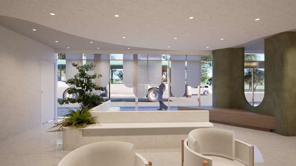 한 부분이 아닌 벽, 천장, 가구 전체에 곡면을 사용하여 이용객들을 다정하게 감싸 안는 듯한 느낌을 연출했습니다.